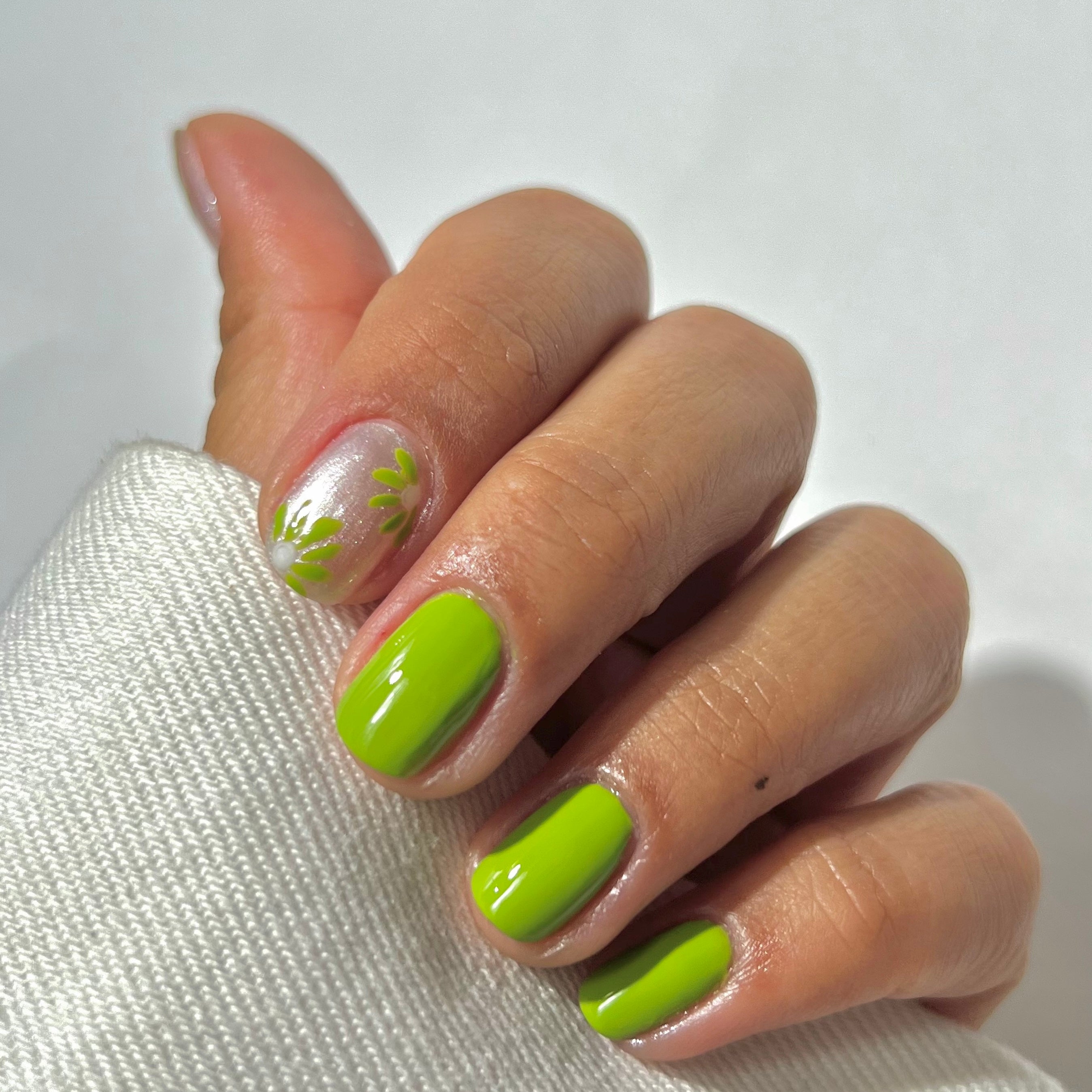 Step 2: Apply Petit Pois to three nails and Moon to the other two, then put your whole hand under the lamp to dry